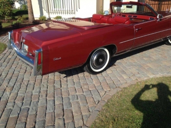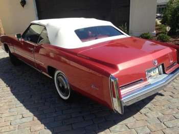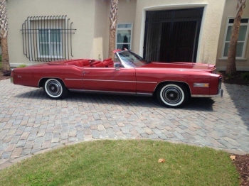 CADILLAC: 1976 Eldorado Convertible, Firethorn, 50-50 soft red leather 6 way electric seats with passenger recliner, white top. Fully powered and equipped including, AM/FM 8 track radio, cruise control, twilight sentinel, illuminated entry system, automatic climate control, t & t wheel, parade boot, remote control rear view mirrors, automatic level control, high altitude performance package, delayed wiper, remote control trunk, dual 4- wheel disc power brakes, and a host of other standard equipment. New battery, heater core, antenna mast & headlight adjusters. Flawless show car condition, meticulously maintained, no snow, smoke, two owner car.